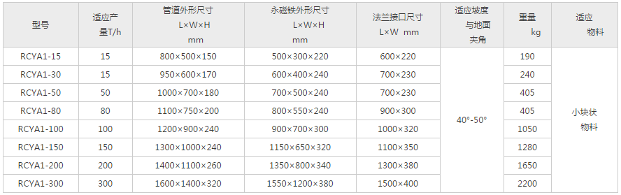 RCYA型傾斜管道式永磁除鐵器分為RCYAl、RCYA2兩種,包括無(wú)磁管道和永磁鐵兩部分,專用于封閉管道內(nèi)非磁性物料的除鐵,永磁除鐵器內(nèi)部采用高性能強(qiáng)磁材料組成復(fù)合磁系。具有體積小、磁力大、重量輕、除鐵干凈、方便、低能耗、使用壽命長(zhǎng)等特點(diǎn)。