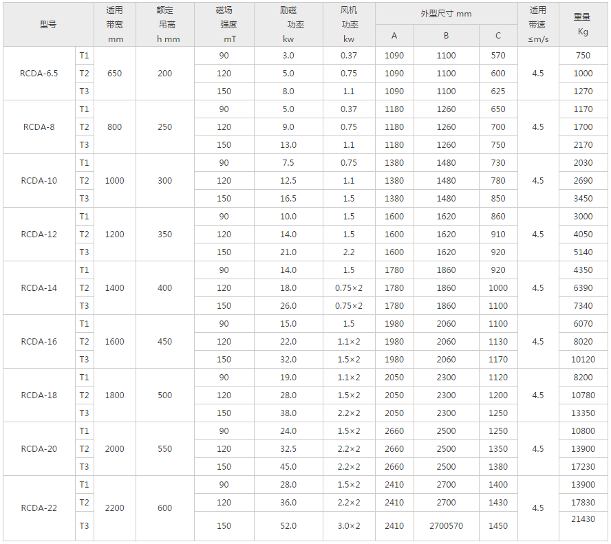 RCDA-T型強風(fēng)冷式電磁除鐵器內(nèi)部磁路設(shè)計獨特,透磁深,吸力大,吸力遠大于國標除鐵器。軸流式風(fēng)機強迫風(fēng)冷,風(fēng)量大,使除鐵器散熱快、溫升低,保障除鐵器無故障長期工作。